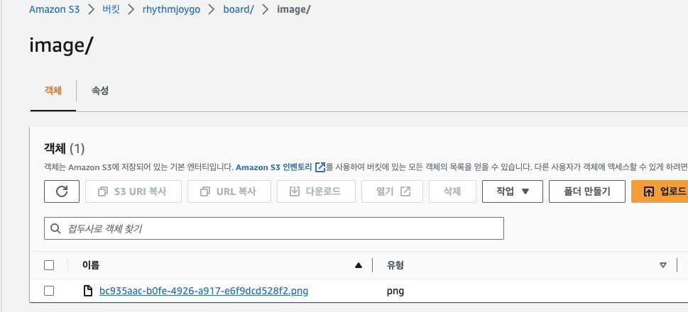 // 이미지 업로드 @Override public void upload(List<MultipartFile> multipartFiles, BasicBoard basicBoard) throws IOException { // 이미지를 담을 uploadImages 리스트 생성 List<String> uploadImages = new ArrayList<>(); // 이미지가 있는지 확인하는 imageExistCheck 선언 boolean imageExistCheck = false; // 매개변수로 들어온 multipartFiles (이미지 파일들)을 반복문을 들린다. for (MultipartFile multipartFile : multipartFiles) { // 이미지 파일이 비어있지 않으면 imageExistCheck를 true로 변경 if (!multipartFile.isEmpty()) { imageExistCheck = true; } } // imegeExistCheck가 true면, uploadImages에 awsS3Service.upload 메서드를 사용해 이미지를 담는다. if (imageExistCheck) { uploadImages = awsS3Service.upload(multipartFiles); } // uploadImages의 이미지들을 반복문을 돌려 boardImage에 저장한다. for (String imagePath : uploadImages) { BoardImage boardImage = new BoardImage(imagePath, basicBoard); boardImageRepository.save(boardImage); } }원래 boardImage 엔티티에 originalName, fileSize 필드를 선언했었는데, awsS3Service에 이미지를 업로드 시키는 메서드가