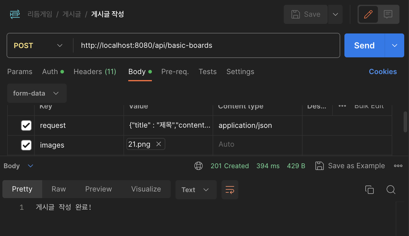 게시글 작성 버튼을 누른 후 제목과 내용, 이미지를 첨부한 후 작성 버튼을 눌렀다.